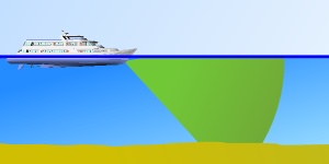 12° vertical coverage angled down 20° can't detect objects from the sea surface to the keel.